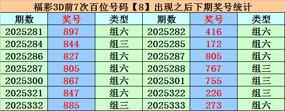 在百位号码8前7次开出之后,其下期分别开出号码:4、1、8、7、7、2、2,其中号码奇偶比为3:4,大小比为3:4,012路比为0:4:3。