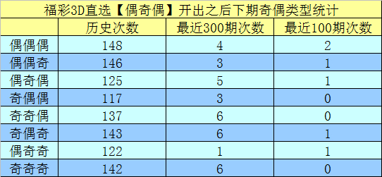 前7次出现偶奇偶类型奖号分别为:010、072、674、416、430、294、050,其下期分别开出奖号:736、264、055、664、294、121、885。