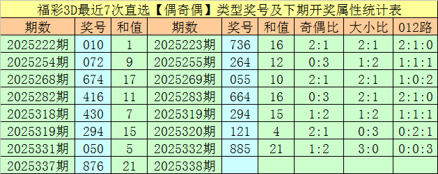 开奖回顾:福彩3D第2025337期开奖号码为876,奖号直选类型为:偶奇偶、大大大和210路。