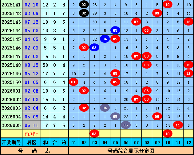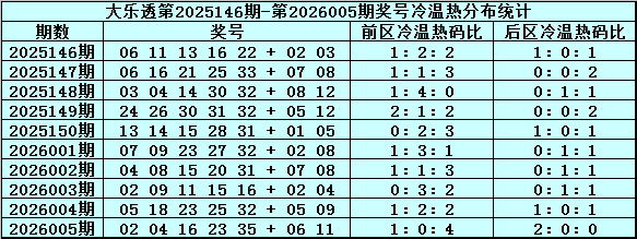 后区第一位:上期该位开出号码06,为遗漏22期的冷码,前7期该位分别遗漏:3期、10期、4期、4期、1期、3期、22期,其中冷温热号码个数比为2:2:3,温码出现较少,本期适当关注回补,注意温码03。