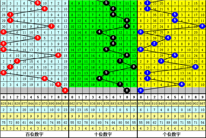 跨度、和值分析:近期跨度主要分布在2-8区域,比较分散,本期预计跨度上升,参考跨度9。和值近期波动范围较大,上期开出和值21,本期预计和值下降,参考和值17。